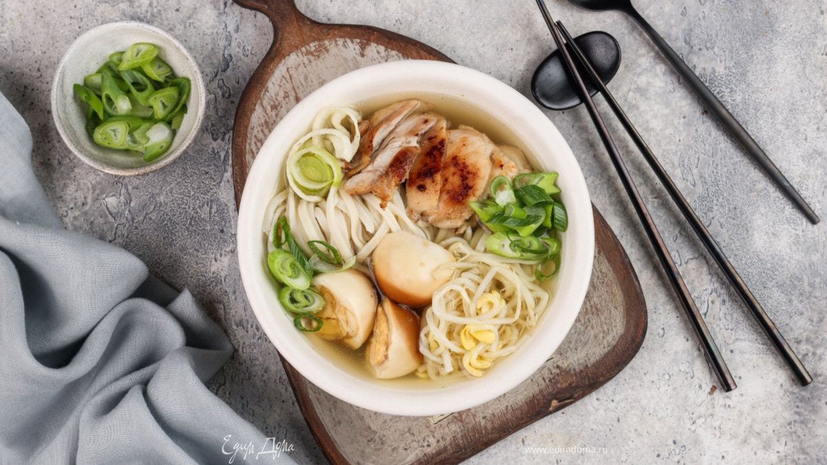 Соберите рамен. В миску выложите готовую лапшу, нарезанную курицу, яйца, соевые ростки и зелень. Залейте все бульоном и подавайте. Приятного аппетита!
