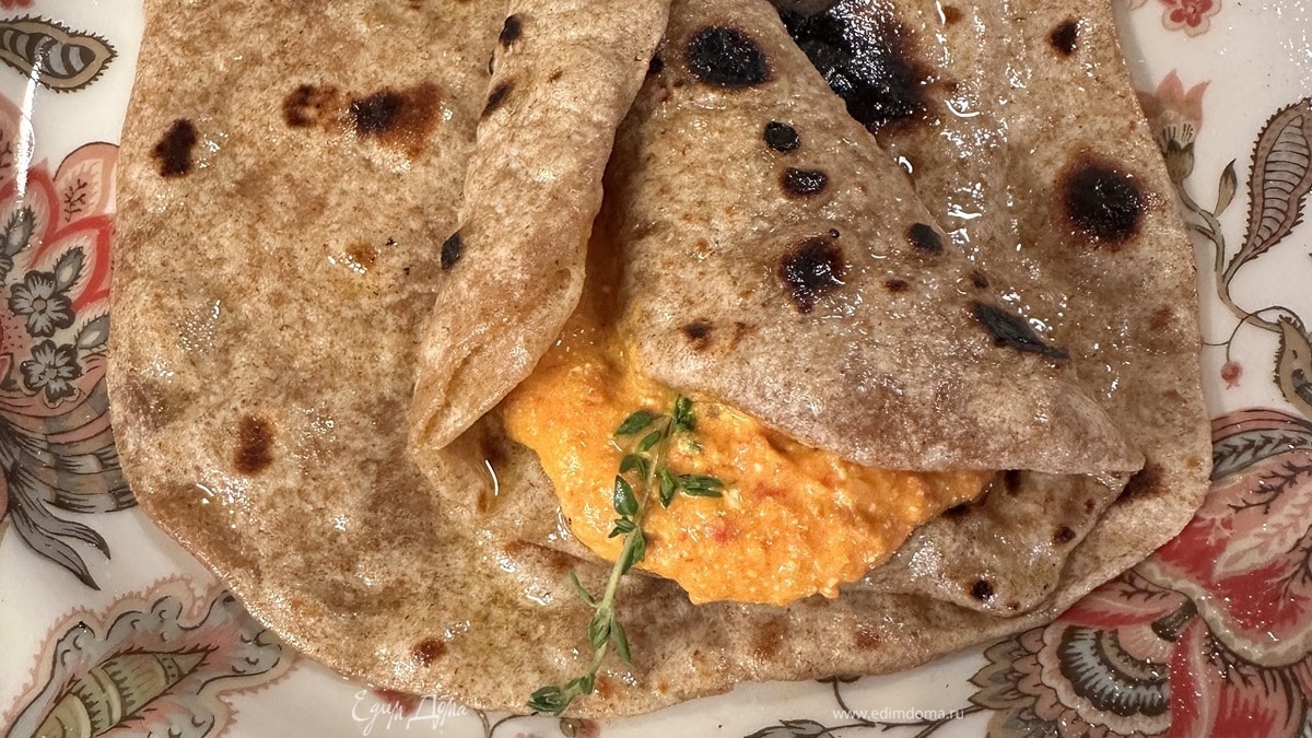 Домашние лепешки с дипом из сладкого перца, помидоров и феты