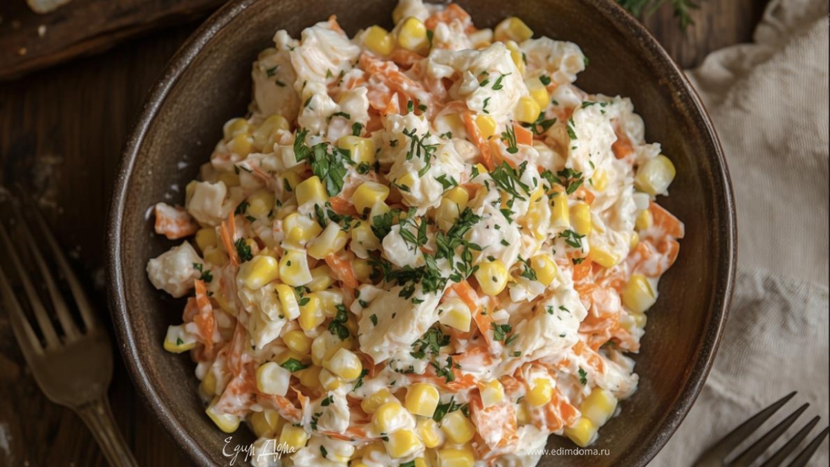 В большой миске соедините нарезку из яиц и крабовых палочек с кукурузой и морковью по-корейски.