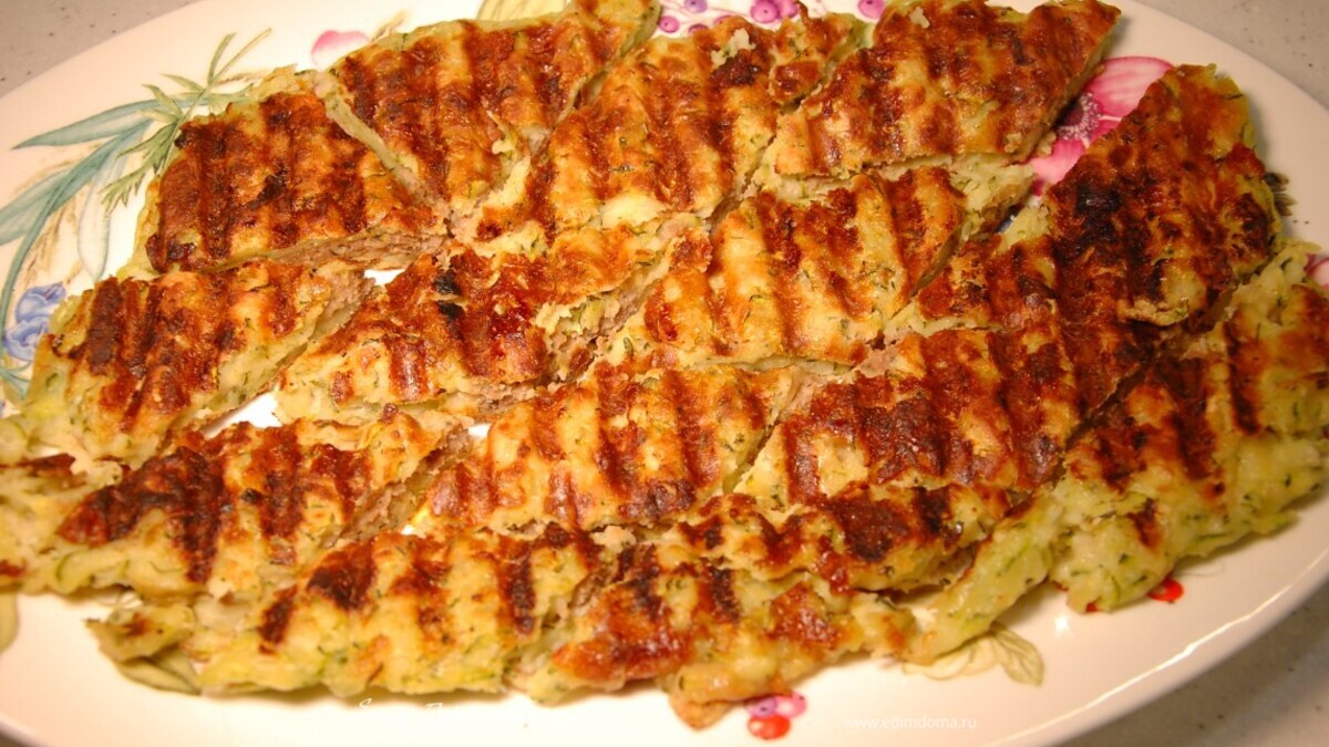 Разогретый электрический гриль смазать растительным маслом, выложить половину теста из цукини и распределить его в пласт, сверху разложить фарш, затем ломтики сыра, накрыть все оставшимся цукини. - Шаг 5