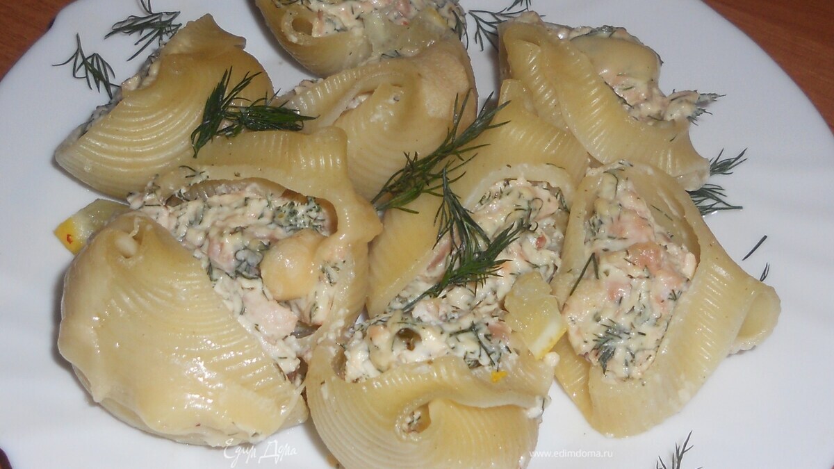 духовку предварительно разогреть. Ракушки начинить творожной массой, уложить в жаропрочную посуду, запекать буквально минут 10. При желании перед запеканием присыпать тертым твердым сыром, а можно каким-нибудь интересным, мягким. Можно вооще залить соусом, лично мне по душе паста без лишней жидкости:)Украсить свежим укропом и лимонной цедрой или кусочками лимона, подавать!