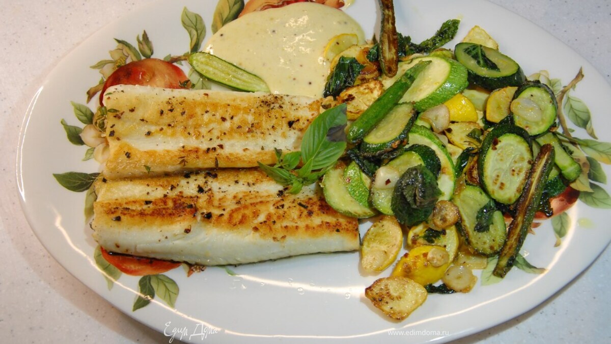 Камбала с жареными кабачками, цукини и патиссонами