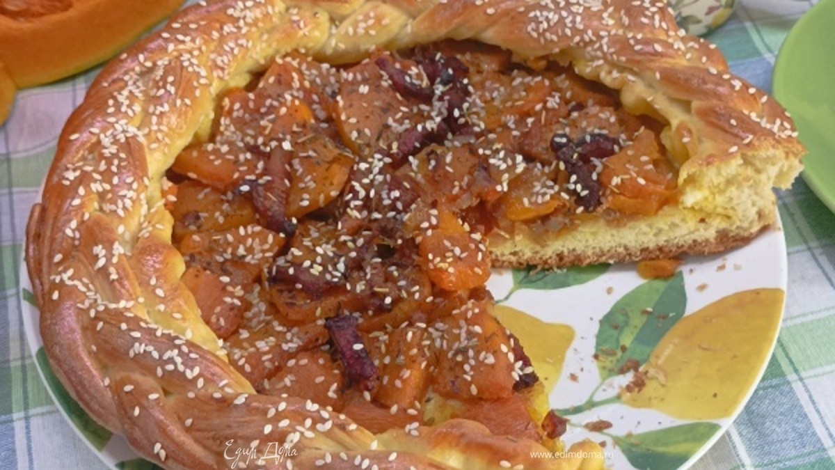 Сплетаем из тонких полосок косичку (это полностью по вашему желанию, можно обойтись и без этого декора). Смазываем бортики смесью желтка и молока (1 ст. л.), выкладываем на них косичку, которую также смазываем и посыпаем кунжутом. Выпекаем пирог в разогретой до 180°С духовке в течение 40–45 минут до золотистой корочки. - Шаг 6