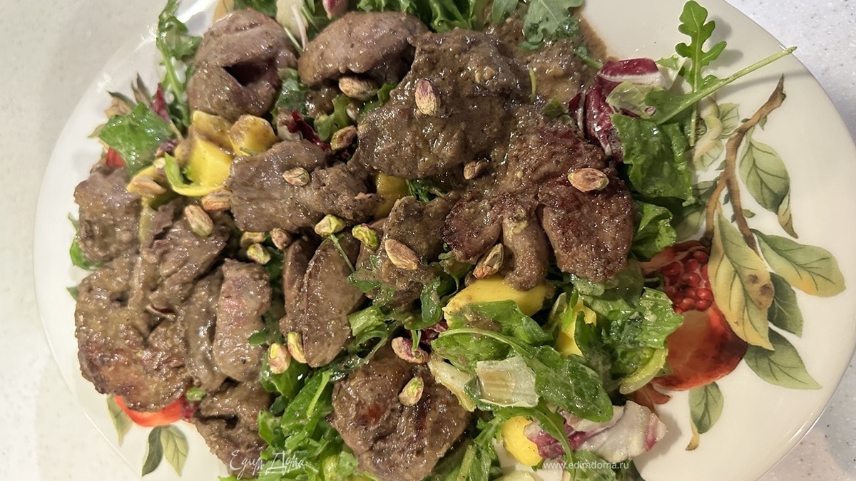 Теплый салат с куриной печенью, манго и фисташками