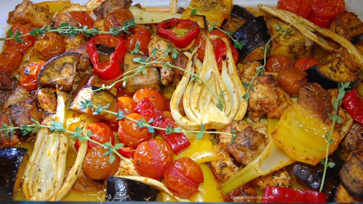 Индейка, запеченная с помидорами, сладким перцем, баклажаном и фенхелем