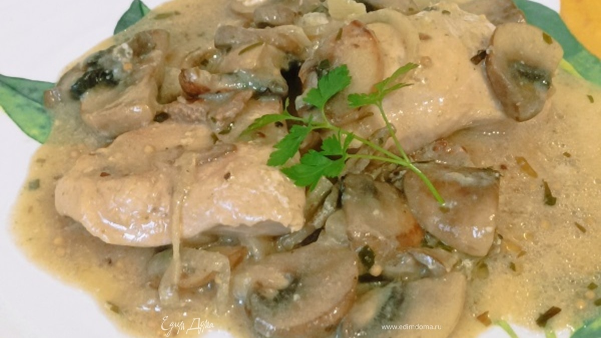 Легкий рецепт в одной посуде — куриные бедра (или голени) с грибами в сливочно-горчичном соусе. Подходит для любого времени года.