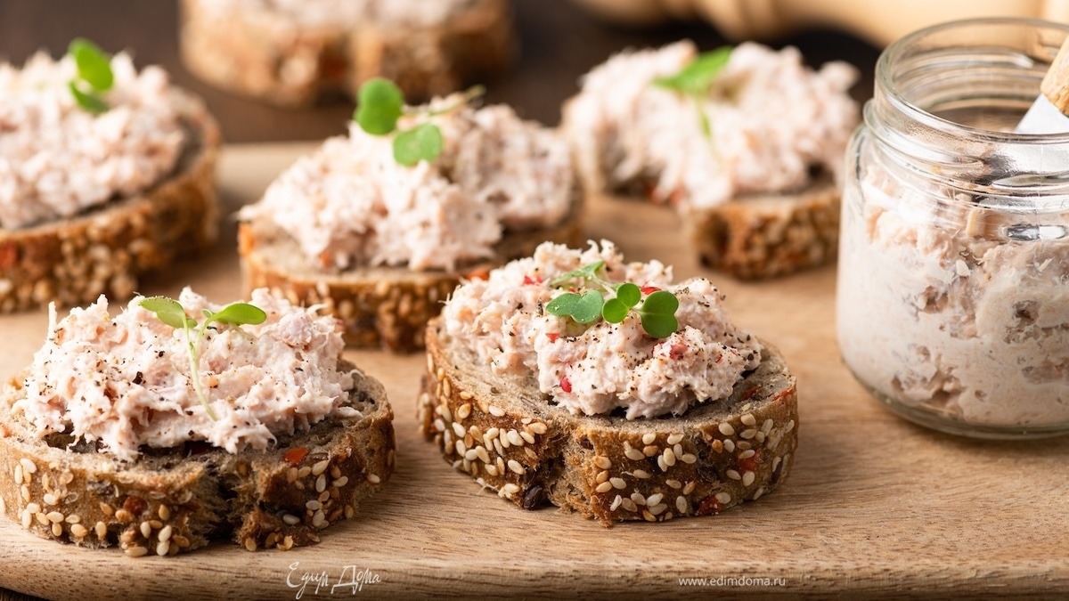 - Шаг 5Подавайте риет из горбуши охлажденным. Выложите закуску в пиалы или на ломтики поджаренного хлеба. Украсьте веточками укропа, каперсами, тонко нарезанным красным луком. По желанию добавьте несколько кусочков сливочного масла.