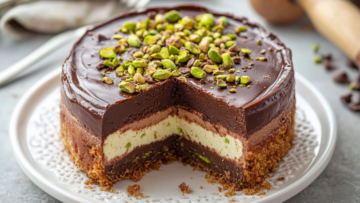 - Шаг 2Для шоколадного слоя растопите темный шоколад на водяной бане или в микроволновке. Взбейте сливки до мягких пиков. В отдельной миске смешайте крем-чиз и сахарную пудру до кремообразной консистенции. Добавьте растопленный шоколад и фисташковую пасту, тщательно перемешайте. Аккуратно введите взбитые сливки в шоколадную смесь, а после выложите шоколадный слой на основу и разровняйте. Поставьте в холодильник на 1 час.