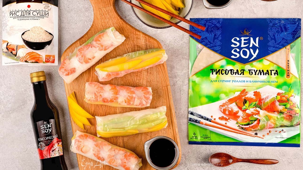 Соберите спринг-ролл: выложите на рисовую бумагу рис, затем креветки, огурцы и кусочки манго. Сверните и подавайте с соевым соусом Sen Soy «Классический».
