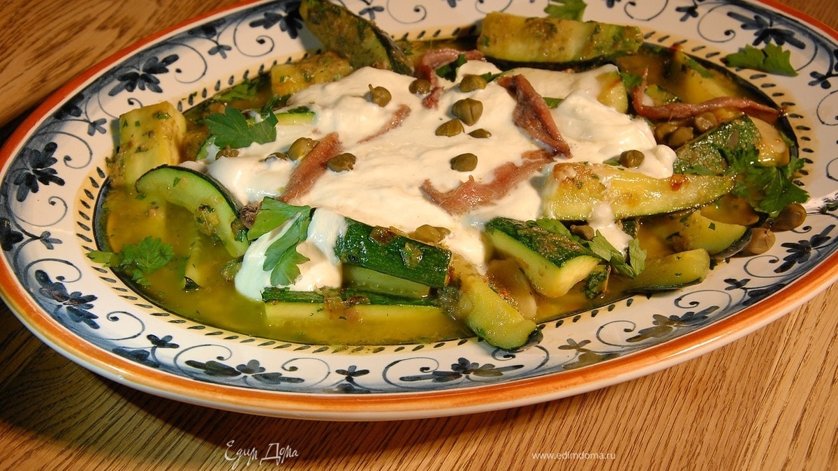 Этот салат интересен своей простотой, есть его можно и теплым, но мне кажется, он прекрасен, когда уже остыл. Цукини нужно обжарить так. чтобы они запечатались со всех сторон и при этом сохранили свою упругость, остались такими немного звонкими внутри, но, конечно, не сырыми.