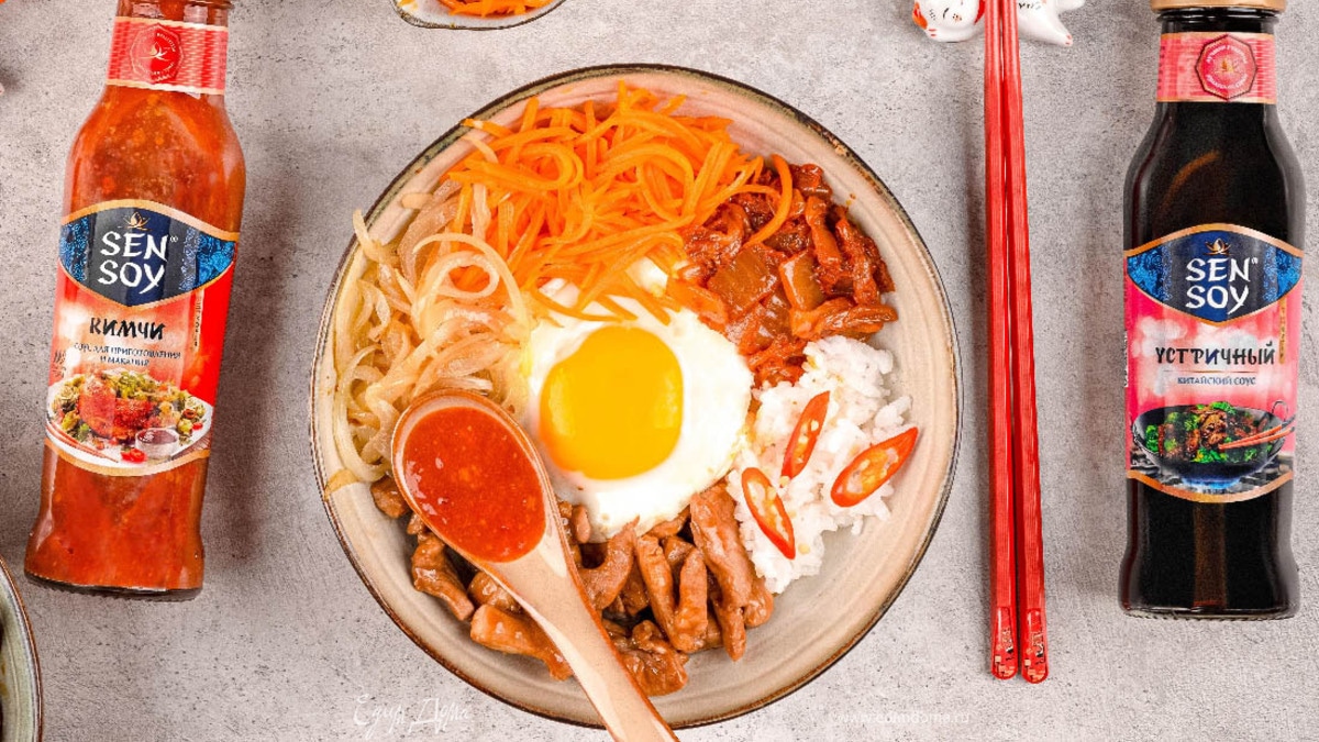 Выложите рис в пиалу, по кругу отдельно лук, морковь, свинину и яйцо по центру. Добавьте соус «Кимчи» от Sen Soy по вкусу.
