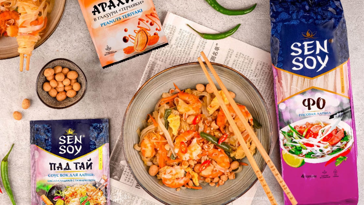 Разложите пад-тай по тарелкам, украсьте арахисом в глазури «Терияки» Sen Soy.