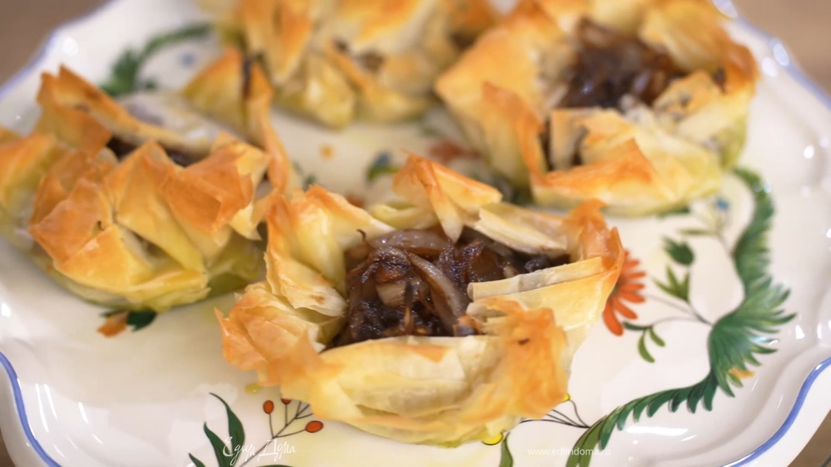 Уложить тесто в плоские тарталетки, так чтобы края свешивались, разложить зеленый соус, цукини и баклажаны, вяленые помидоры, обжаренный лук и накрыть начинку краями теста.