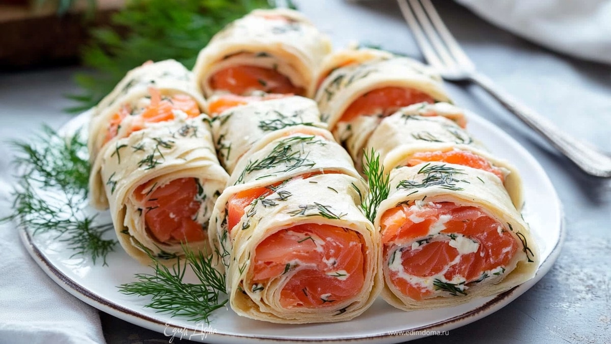 - Шаг 3На каждый лист лаваша нанесите слой плавленого сыра. По краям оставьте немного свободного места. Сверху на сыр добавьте ломтики красной рыбы. Начинку посыпьте укропом.