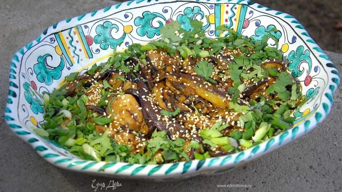 Обжаренные баклажаны выложить в заправку и перемешать, затем переложить в керамическое блюдо, посыпать кунжутом и измельченной зеленью.