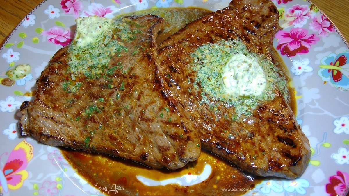 Когда мясо будет практически готово, выложить на каждый кусок по 1–2 ч. ложки зеленого масла и снять сковороду с огня.