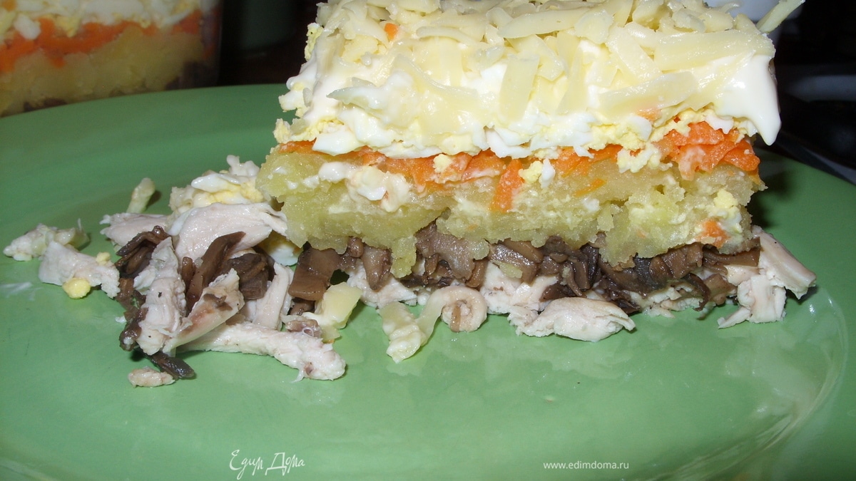 Салат выкладывается слоями! Сначала нарезаная соломкой курица, затем обжаренные грибы, затем натертый картофель, затем натертая морковь,(между картофелем и морковью посолить) Затем натртые яйца, потом слой майонеза, и посыпать тертым сыром. накрыть и отставить на часок в холодильник)) все) - Шаг 2Отварить куринную грудку, картофель и морковь и яйца, грибы нарезать соломкой момельче и обжарить в подсолнечном масле.( я жарю сливочное с растительным)