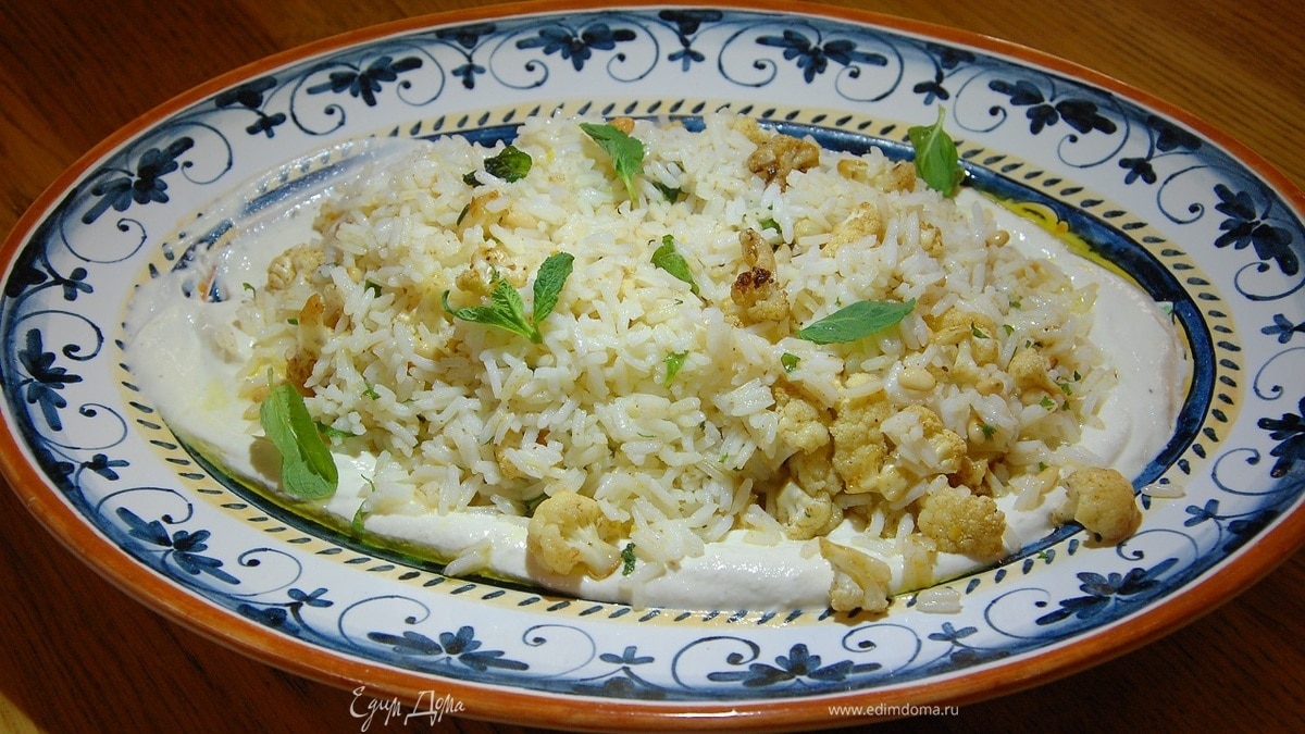 Рис перемешать с цветной капустой, кедровыми орехами и мятой, выложить все на тарелку с йогуртом, полить оставшимся оливковым маслом и украсить отложенными листьями мяты.Перед подачей дайте блюду немного настояться — вкусы лучше раскроются.