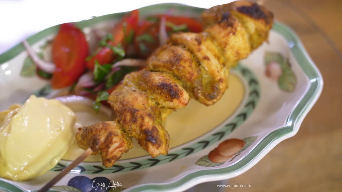 Куриные шашлычки в карри-маринаде со свежим салатом и чесночным майонезом