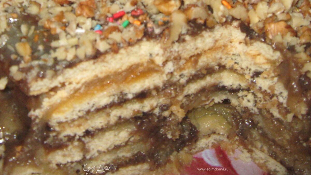 - Шаг 1По рецепту делаем обычное песочное тесто.Выпикаем несколько тонких коржей (у меня 6).Готовим пропитку: на водяной бане смешиваем масло с шоколадом, но помадке даем чуть подостыть, затем смазываем коржи, все кроме нижнего. На нижний сразу начинку, но хорошо пропитав ее жидкой частью. Начинка6 на терке Бюрнера тонкими кружочками шинкуем яблоки(без кожуры) и лимоны(без цедры). Засыпаем сахаром и,добавив масло, ставим на маленький огонек и варим такое карамельное варенье. Когда начинка готова, пропитываем нижний и распределяем по коржу яблоко с лимонами, ложим на верх корж той стороной ,которая намазана помадкой. Коржи опять промазываем начинкой и тд. Верхний корж намазываем помадкой, и дав чуть подостыть поливаем "карамелью" из варенья и посыпаем орешками. Охлаждаем тортик.