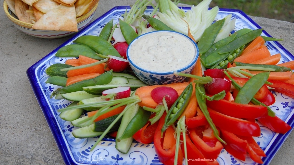 На большую тарелку выложить веером все овощи, в центр поместить пиалу с соусом и подавать с чипсами.