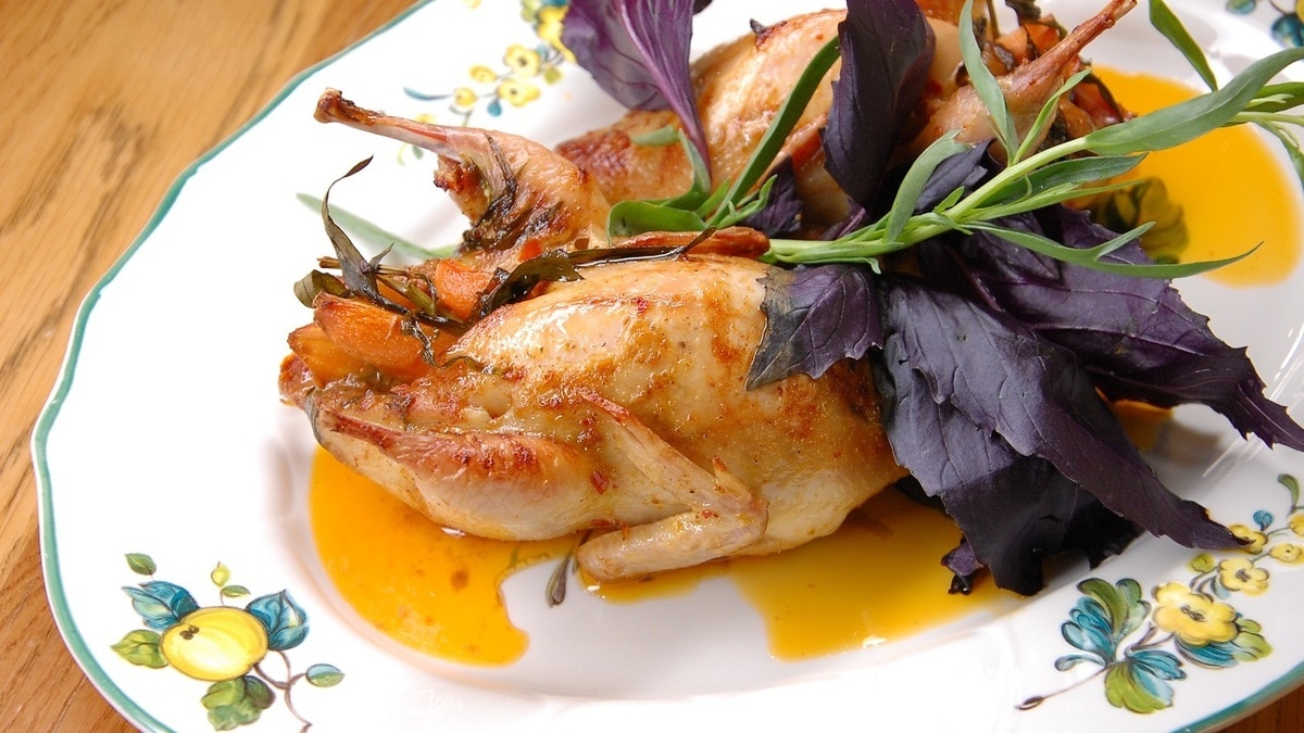Готовых перепелок украсить оставшимся тархуном и базиликом.