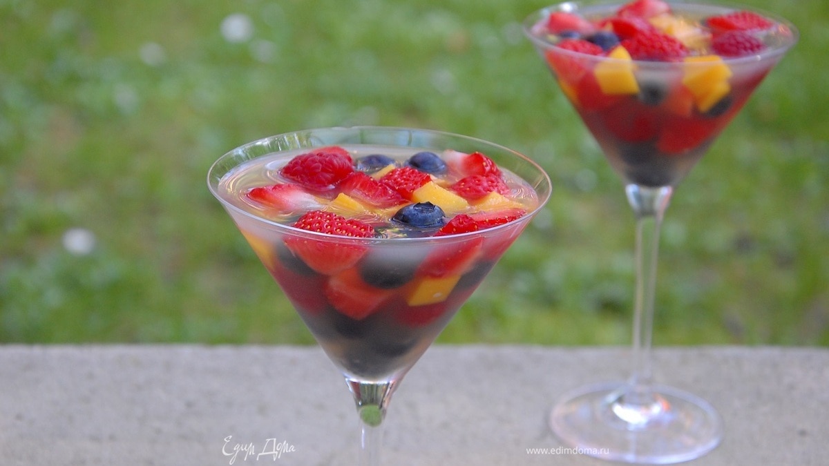 Разложить все ягоды и манго в прозрачные бокалы, залить травяным чаем и отправить десерт в холодильник до полного застывания.