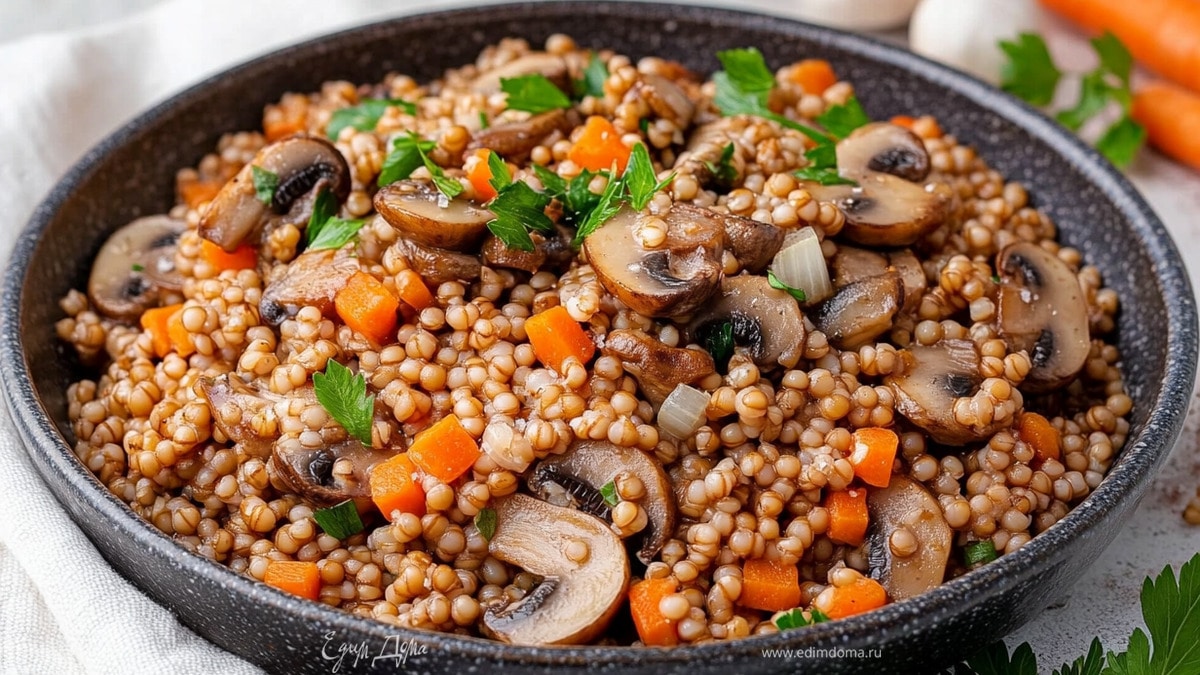 - Шаг 5Отваренную гречку добавьте в сковороду с грибами и овощами и хорошо перемешайте. Прогрейте все на слабом огне 2-3 минуты, чтобы гречка напиталась овощными и грибными ароматами.