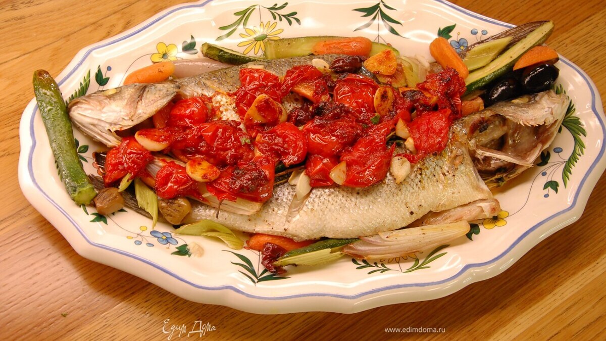 Запеченный с сезонными овощами сибас под свежим томатным соусом