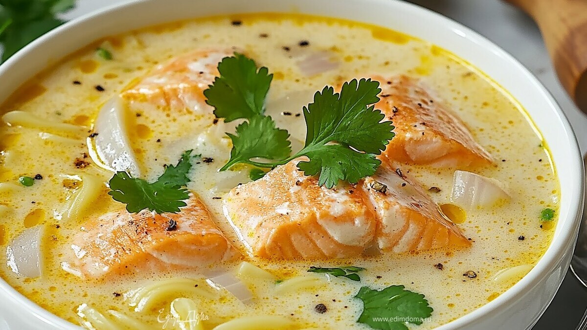 - Шаг 6Влейте в кастрюлю рыбный бульон и доведите все до кипения. Затем добавьте кокосовое молоко, перемешайте, убавьте огонь и выложите кусочки лосося. Готовьте около 5 минут до полной готовности рыбы.