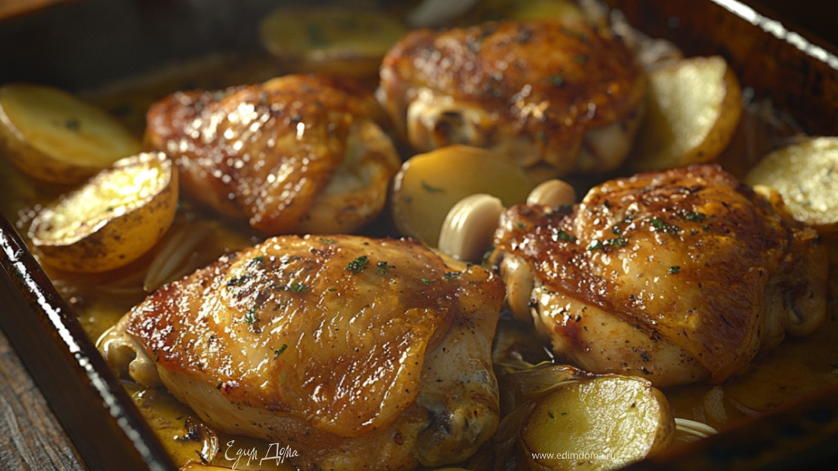 По желанию можно в середине перевернуть курицу и картошку. - Шаг 6Подавайте горячим, прямо из формы, посыпав свежей зеленью.