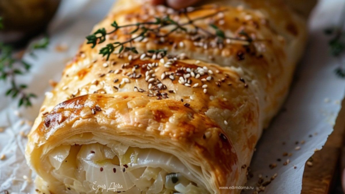 Выложите остывшую начинку по центру, оставляя края по 3–4 см. Заверните края, чтобы получился плотный рулет. Защипните шов и аккуратно переверните швом вниз. - Шаг 7Переложите пирог на противень с пергаментом. Сделайте сверху неглубокие надрезы (как на фото) и смажьте пирог растительным молоком или водой. Посыпьте кунжутом.