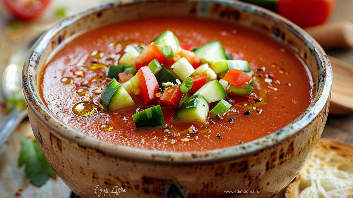 Освежающий холодный суп родом из Испании. Гаспачо готовится из спелых томатов, перца, огурцов и лука — без варки, всего за несколько минут. Прекрасно подходит для жарких дней, особенно если охладить его перед подачей. Вкус яркий, овощной, с лёгкой кислинкой.