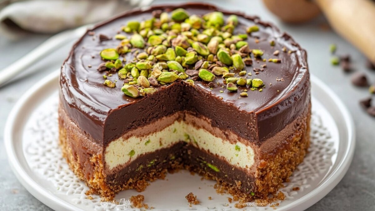 Взбейте сливки до мягких пиков. В отдельной миске смешайте крем-сыр и сахарную пудру до кремообразной консистенции. Добавьте растопленный шоколад и фисташковую пасту, тщательно перемешайте. Аккуратно введите взбитые сливки в шоколадную смесь. Выложите шоколадный слой на основу и разровняйте. Поставьте в холодильник на 1 час.
