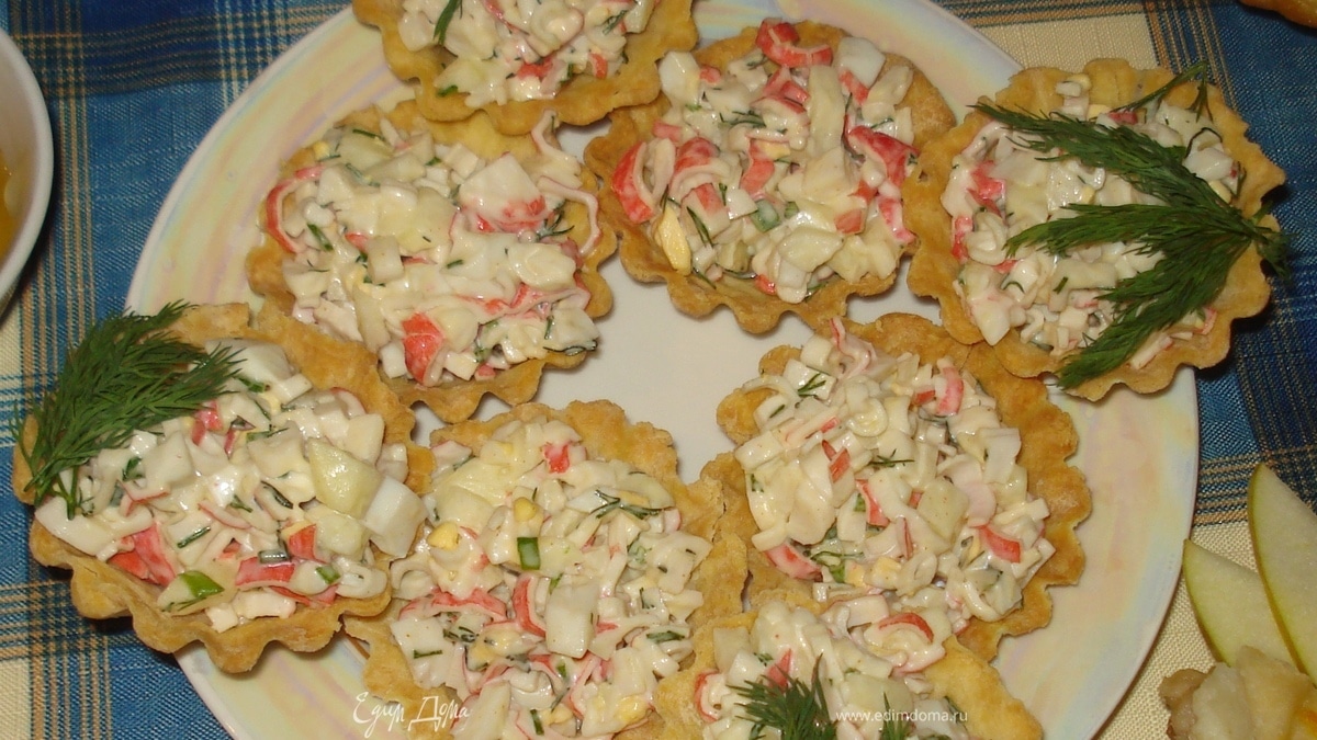 - Шаг 3Начинка для корзиночек: мелко нарезать крабовые палочки, вареное яйцо, зеленый лук, петрушку, укроп, базилик и яблоко. Заправить смесь майонезом и разложить по корзиночкам.
