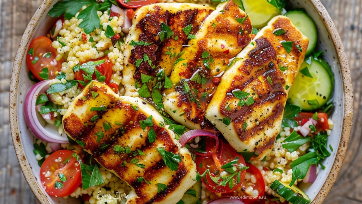 Яркий, сытный салат в средиземноморском стиле: теплый булгур, хрустящие овощи и румяный сыр халуми. Отличный вариант как для легкого обеда, так и для ужина.