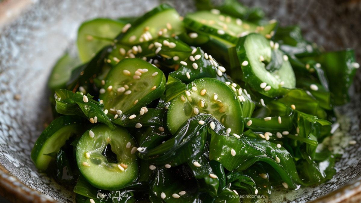 Легкий, освежающий салат с морскими водорослями, хрустящими огурцами и ароматной кунжутной заправкой. Отлично подойдет как закуска или гарнир к азиатским блюдам.