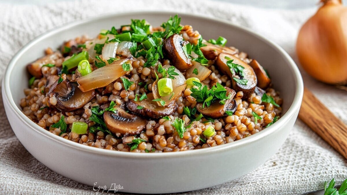 - Шаг 9В сковороду с грибами и луком добавьте готовую гречку. Тщательно перемешайте все ингредиенты, чтобы гречка пропиталась ароматом грибов и лука.