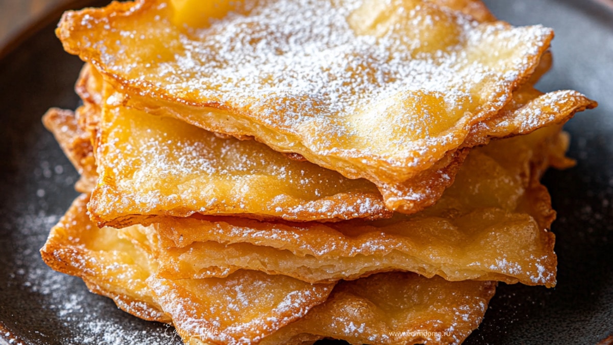 Минимум ингредиентов — максимум хруста. Этот хворост готовится на одних яйцах без добавления жидкости. Тесто плотное, хорошо раскатывается и дает тонкие, хрустящие полоски.