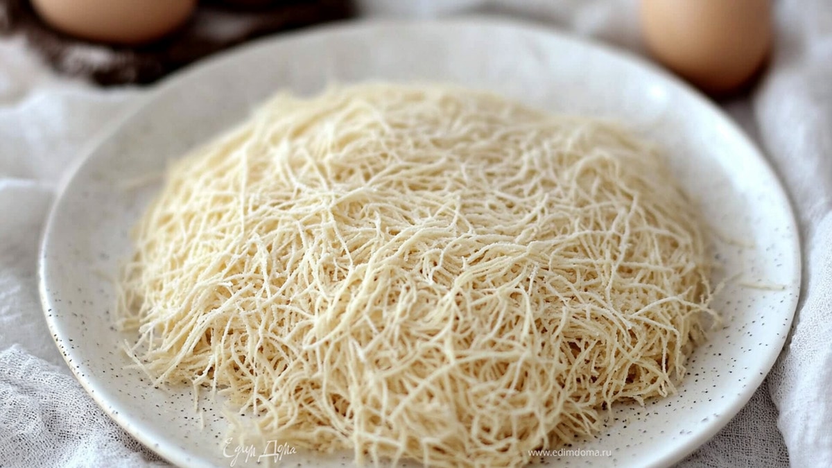 - Шаг 7После того как тесто отдохнет, разделите его на несколько частей для удобства работы. Возьмите одну часть теста и раскатайте ее в очень тонкий пласт, практически прозрачный. Это можно сделать с помощью скалки или специальной машинки для раскатки теста. Нарежьте тонкий пласт теста на длинные тонкие нити, которые будут основой для катаифи.