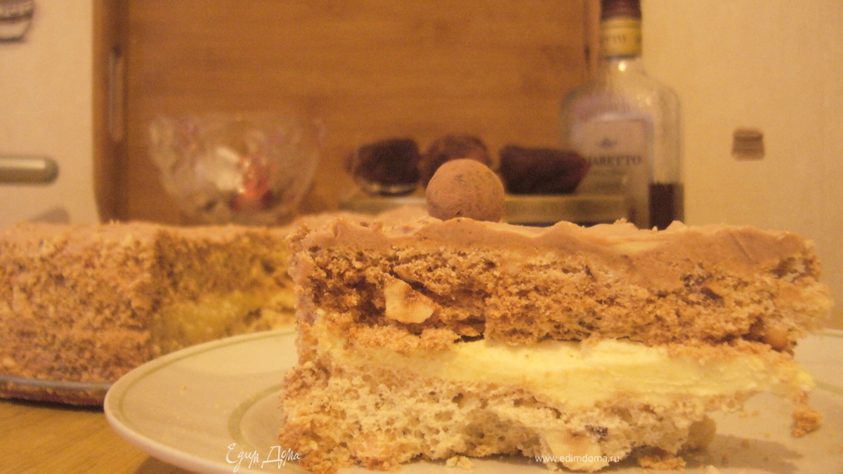 - Шаг 1Заквасьте 200г белков, оставив их на 12-24 часа в теплом месте. На следующий день: Смешайте 45г муки, 150г поджаренных и порубленных орехов (кешью или фундук) и 185г сахара. Белки взбейте в пышную пену как обычно, добавьте 50г сахара и 1 пакетик ванильного сахара, взбейте еще раз хорошенко. В белки добавьте смесь орехов, аккуратно перемешайте. Разложите смесь в две формы, выстеленные бумагой. Важно! Я использовала две формы - 23 и 20 см. БОльший корж вам потом придется подрезать, и получившаяся крошка пойдет на обсыпку торта. Можно использовать также формы 23 и 25 см, торт будет чуть ниже. Средняя высота коржа 2см. Пеките при 150С 2 часа. Я НЕ ЗНАЮ что будет с массой, если ее оставить на два часа, но думаю, что она потеряет свои свойста. Поэтому пеките одновременно два коржа - например, на двух уровнях в духовке. Если у вас нет такой возможности - взбивайте белки отдельно для каждого коржа, чтобы масса не стояла. Готовые коржи оставьте на 12-24 часа для упрочнения структуры. И только затем отделите бумагу. Готовые коржи бежевые. Крем Шарлртт. Масло достаньте из холодильника (250г). Приготовьте сироп. Смешайте 150 мл молока с 1 яйцом в кастрюле. Важно! Смешивать надо тщательно, и до добавления сахара, иначе желток может свернуться от сахара. Всыпьте сахар, поставьте на огонь и доведите до кипения. Варите 4-5 минут, на сиропе начнут появляться пузыри и он станет тягучим. Важно! при такой концентрации сахара яйца НЕ СВОРАЧИВАЮТСЯ при нагреве, так что варите спокойно. Готовый сироп похож по вкусу и кончистенции на сгущенку. Сироп перелейте в миску, остудите, накрыв пленкой. Взбейте масло в светлую массу с пакетиком ванильного сахара. Добавляйте по столовой ложке сироп, взбивая каждый раз. Отделите 200 г крема, смешайте с двумя чайными ложками с горкой какао-порошка. Взбейте миксером. В белый крем добавьте ст. ложку коньяка и взбейте. Один корж (больший) положите на лист вощеной бумаги. Промажьте двумя третями оставшегося белого крема и накройте другим коржом. Подрежьте нижний корж, чтобы торт был ровным. Крошку соберите и измельчите. Бока торта промажьте шоколадным кремом. Оставшимся кремом промажьте верх торта. Оставшийся шоколадный и белый крем разложите по двум корнетикам и украсьте торт по желанию. Бока обсыпьте крошкой. В рецептуру также входят фрукты в сиропе или цукаты. Конечно, после украшения торт надо охладить не менее пары часов.