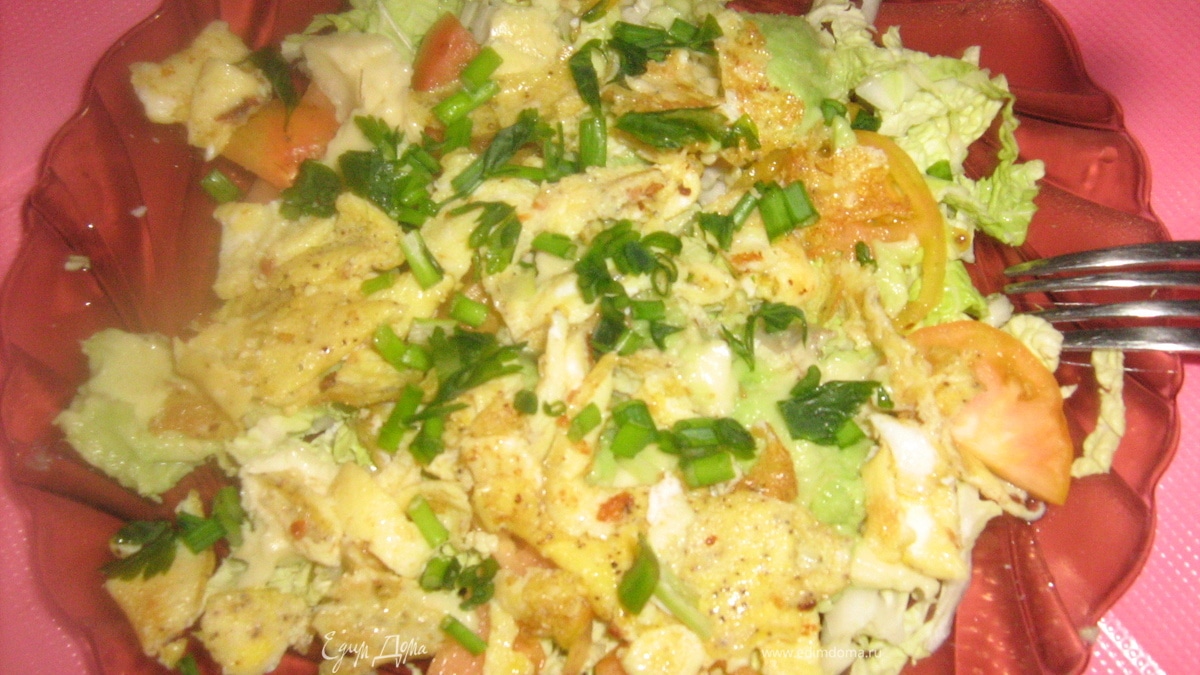 - Шаг 1Яйца взбить вилкой, посолить, поперчить. Масло разогреть в сковороде и поджарить яйца, они должны быть нежными. Из пекинской капусты вырезать твердую часть, остальное нарубить тончайшими полосками. Выложить на тарелку, слегка посолить и взбрызнуть лимонным соком. Помидоры нарезать тонкими дольками и разложить на капусту. Мякоть авокадо брать чайной или кофейной ложкой, чтобы получались хлопья, выкладываем на овощи. Яйца порезать тонкими полосками или квадратами, выложить на овощи. Салат еще раз взбрызнуть лимонным соком, посолить, поперчить и полить маслом. Сверху посыпаем рубленой зеленью. Любители хлеба могут добавить в салат гренки. Приятного аппетита. :-)