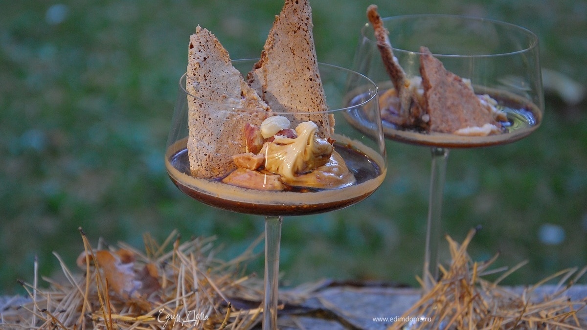 Запеченную меренгу поломать на кусочки и добавить к крему, сверху полить эспрессо.