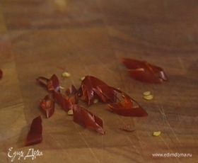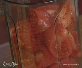Взбить в блендере помидоры, перец чили, чеснок, редьку и кинзу.