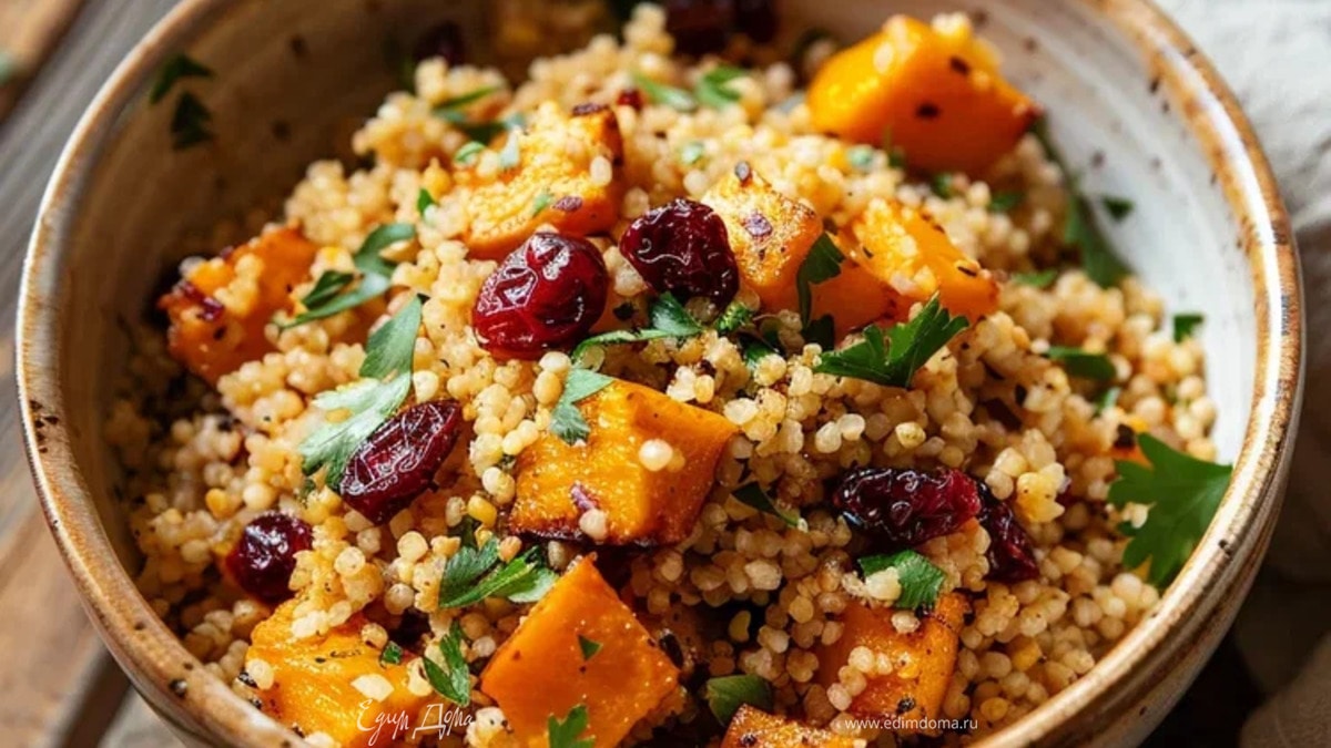 Булгур с тыквой, клюквой и зеленью — осеннее, яркое и полезное блюдо. Подходит как гарнир или лёгкий вегетарианский обед. Сладость тыквы отлично сочетается с кислинкой клюквы и свежей зеленью.
