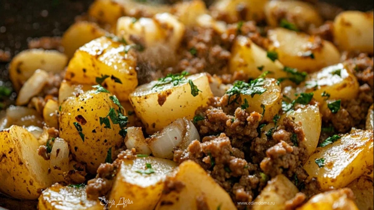 Нежные кусочки картофеля, тушённые с мясным фаршем, луком и специями. Простое, сытное блюдо, которое готовится в одной сковороде и не требует гарнира.