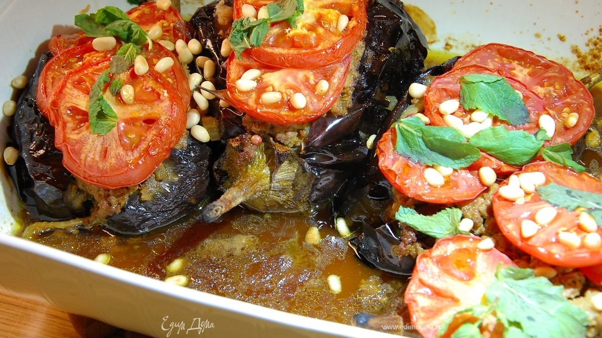 Запекать в разогретой духовке 20–25 минут, готовые баклажаны посыпать измельченной руками мятой и кедровыми орехами.