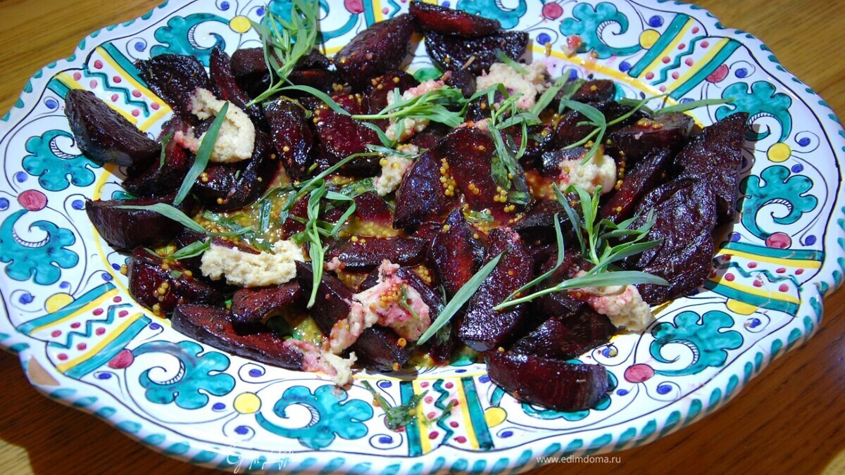 На блюдо выложить запеченную свеклу, полить заправкой и украсить листьями тархуна, сверху добавить ореховый соус.