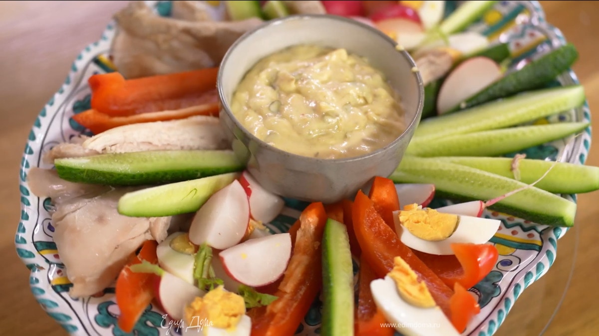 Соус айоли выложить в пиалу и поставить в центре большого блюда, вокруг разложить нарезанные овощи и куриное мясо.
