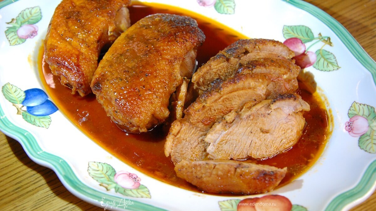 Утиные грудки, запеченные под острым томатным соусом с рисовым вином и медом